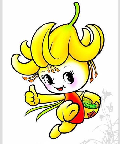 “萱萱”头戴黄花帽,身穿红肚兜,左挎小提篮,一脸俏皮和欢悦!她由四川美术学院教师刘斌设计。