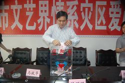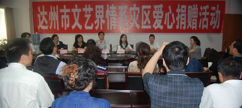 自5月12日我省阿坝州汶川县发生7.8级特大地震后,达州市委宣传部、市文化局、市文联积极响应市委、市政府号召,以高度的政治责任感,情系灾区,动员全市文艺界于2008年5月14日下午开展了 “情系灾区、爱心捐赠”活动,共计60余人参加了此次活动。大家慷慨解囊,共捐款13500元,并于当天将捐款通过市慈善会转向灾区,以实际行动表明了文艺界人士对灾区人民的支援和对社会责任的担当。