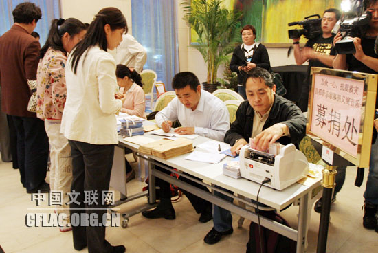 演出现场外设立的捐款处始终忙碌不停。中国文联网 彭宽/摄