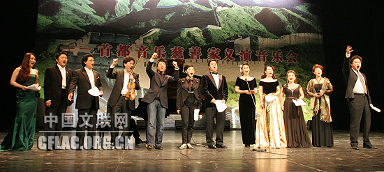 15日晚,由北京市文联、北京音协、北京市团委、北京市青少年发展基金会,北京音乐台等10余家单位携手主办的“万众一心 抗震救灾”首都音乐家慈善义演音乐会在解放军歌剧院举行。这台从策划到演出不足24小时的慈善义演阵容强大、群星璀璨,有郎朗、吕思清、戴玉强、范竞马、殷秀梅、吴碧霞、张也、金曼、尤泓斐等著名音乐家的倾力加盟,有特意从国外赶来参加演出的歌唱家张立萍、张建一等,还有得知义演消息后纷纷赶来剧场登台演唱的年轻歌唱家沈娜、王丽、张海庆等。3个多小时的演出,始终洋溢着激情与深情,演唱与演奏成为最好的仪式,以此向地震灾害中的骨肉同胞表达爱的致意。