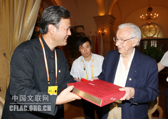 中国摄影家协会分党组书记、副主席兼秘书长李前光将画册赠送给国际奥委会终身荣誉主席萨马兰奇先生。匡林华 摄