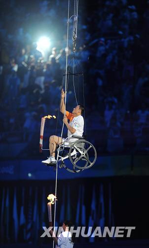 9月6日,最后一棒火炬手、残奥会田径金牌获得者侯斌(上)准备点燃主火炬。当日,北京2008年残奥会开幕式在国家体育场“鸟巢”举行。新华社记者王雷摄