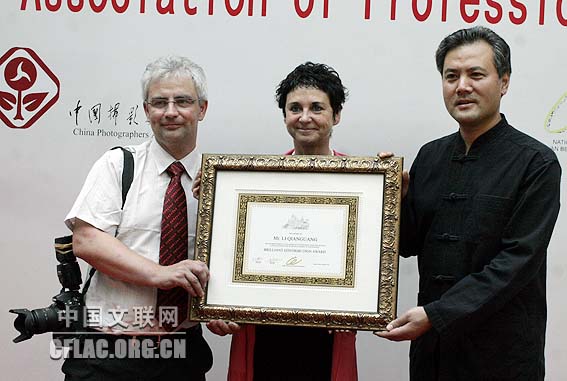 尼克·胡兹为李前光颁发“国际摄影杰出贡献奖”获奖证书。中国文联网 郭青剑 摄