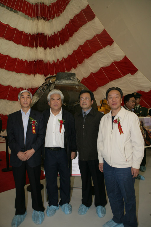 冯远、张海、申万胜、马振声在返回舱前合影。中国文联网 孟祥宁 摄