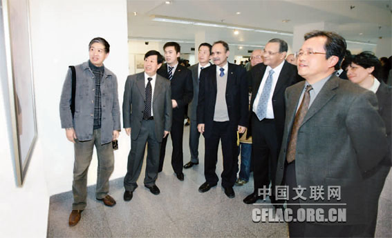 冯远、刘大为向埃及友人介绍“同一个世界”艺术大展参展作品。中国文联网 孟祥宁 摄
