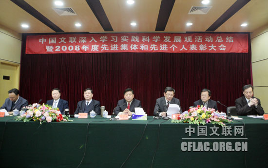 2月25日,中国文联召开深入学习实践科学发展观活动总结暨2008年度先进集体和先进个人表彰大会。中国文联党组书记、副主席、中国文联学习实践科学发展观活动领导小组组长胡振民,中央第15指导检查组副组长、陕西省政协副主席王晓安,中国文联党组副书记、副主席、中国文联学习实践科学发展观活动领导小组副组长李牧,中国文联党组成员、副主席、中国文联学习实践科学发展观活动领导小组成员冯远、杨志今,中国文联党组成员、书记处书记、中国文联学习实践科学发展观活动领导小组成员廖奔、白庚胜出席总结大会。冯远主持会议。