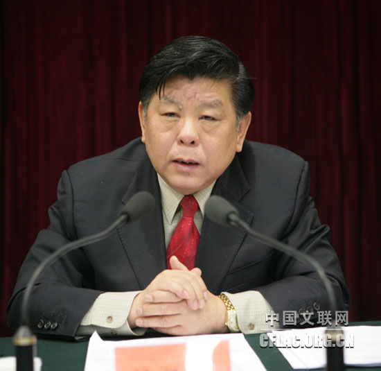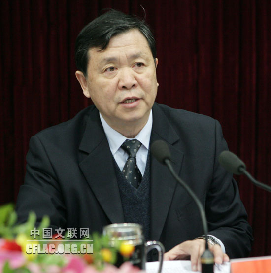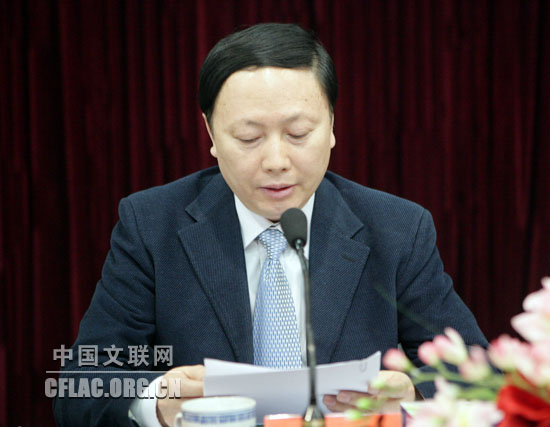 2月25日,中国文联召开深入学习实践科学发展观活动总结暨2008年度先进集体和先进个人表彰大会。图为中国文联党组书记、副主席胡振民讲话。中国文联网 孟祥宁 摄
