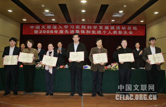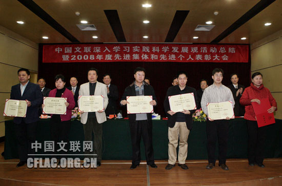 2月25日,中国文联召开深入学习实践科学发展观活动总结暨2008年度先进集体和先进个人表彰大会。图为与会领导为先进集体颁奖。中国文联网 孟祥宁 摄
