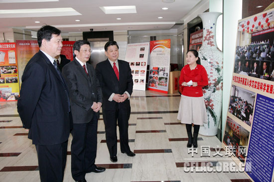 2月25日,中国文联召开深入学习实践科学发展观活动总结暨2008年度先进集体和先进个人表彰大会。图为中国文联党组书记、副主席胡振民,中央学习实践活动第15指导检查组副组长、陕西省政协副主席王晓安,中国文联党组副书记、副主席李牧观看中国文联深入学习实践科学发展观活动展板。中国文联网 孟祥宁 摄