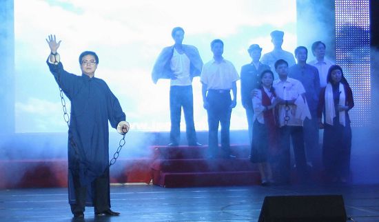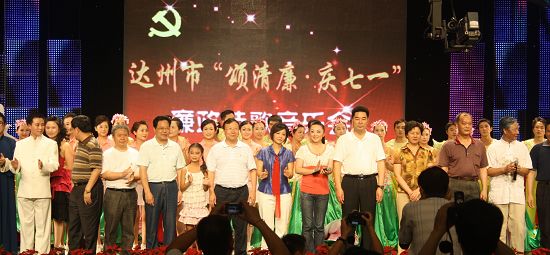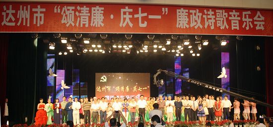 6月26日晚,由市纪委、市委组织部、市委宣传部、市监察局主办,达州市文联、达州市文化局、达州广播电视局共同承办的主题为“颂清廉·庆七一”的大型配乐(舞蹈)诗歌朗诵会在达城中心广场演艺术中心隆重举行。市委书记、市人大常委会主任李向志,市委副书记、市长何健出席诗歌音乐会。近千名观众观看了演出。 诗歌音乐会在配乐诗朗诵《旗帜飘扬》中拉开帷幕。来自市文化局、市文联、市广电局、四川文理学院,各县(市、区)的百多位演出人员,先后朗诵表演了情景诗画《红色誓言》、《巴山红叶》、情景诗舞《镰刀与梦》、配乐诗舞《达州颂》、音乐诗舞《春涌巴山》、音乐诗剧《老人·孩子·大山》等精彩纷呈的节目。 整台演出把廉政教育内容寓于高雅的诗歌和音乐之中,融思想性与艺术性于一体,形式新颖,感染力强,让现场观众在享受高雅艺术的同时,接受了一次深刻的廉政教育。由万源市纪委选送的音乐诗舞《春涌巴山》,共朗诵了达州7位诗人的7首短诗,他们以动情的朗诵、优美的舞蹈、动听的音乐、精致的画面,演绎了纯真美丽的诗章,把整个朗诵会推入高潮。在近两个小时的朗诵晚会中,剧场座无虚席,十分安静,直到演出结束时,大家还安静地坐着,不舍离去。 据了解,晚会作品大部分都是通过在全市范围内公开征稿,从300多首诗歌中筛选出来的优秀作品。七个县(市、区)及各参演单位认真负责、精心编排,精益求精,把各自负责的作品都打造成了精品。因此,这次晚会既是在巴山舞台上立下一座高雅艺术的丰碑,又是对达州诗歌发展的一次检阅,更是近年来达州诗歌发展历程中继“元九登高节广场赛诗会”、“达州诗歌创作高峰论坛”、“中国达州诗歌之乡”命名、纪念“5·12”汶川大地震周年大型诗歌朗诵会后,又一个亮点和重大诗歌事件,充分展现了这方热土是诗性的热土,这方百姓是诗歌的爱好者。 市政协主席康莲英,市委副书记、市纪委书记胥健,市委常委、总工会主席江师科,市委常委、组织部长杨天宗,市委常委、副市长何平,市委常委、达州军分区政委杨清华,市人大常委会副主任熊清明等观看了演出。 演出结束后,李向志、何健、康莲英、胥健等领导还走上舞台,与演职人员一一握手,祝贺演出圆满成功,并与全体参演人员合影留念。