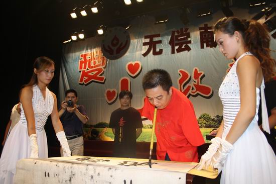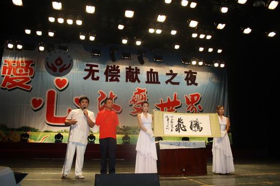 无臂书法家王建华当场献艺,以口代手,衔笔疾书,一幅遒劲洒脱的“腾飞”书法令人叫绝!王建华将此幅作品送给了达州市中心血站,表达他对达州市中心血站的美好祝愿。