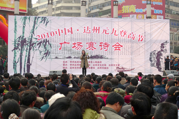 2009“元九”登高节广场赛诗会是由中共达州市委、市政府主办;市委宣传部、市文化局、市文联承办;市作家协会、市戏剧家协会、市曲艺家协会协办。在新春佳节和元九登高的浓厚氛围下,包括工人、农民、干部、老师、学生、文化学者等都踊跃参加赛诗会,他们朗诵的既有古代诗,又有现代诗,更有本土作者和各阶层群众自己创作的诗歌,内容鲜活全面。特别是来至旅居美国的达州籍知名诗人陈官煊深情并茂地朗诵了自己创作的《妈妈》诗作,成为赛诗会上的亮点,让中心广场一时成为诗的海洋。整个赛诗会历时两个小时,共有48人参赛,观众上万人。