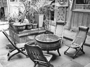 室内陈设简单。床是木床,铺着席梦思,靠墙的电视机旁,放了两把老式圈椅,还有一只竹壳热水瓶。我泡了一杯热茶,来到室外的厅堂,面向天井而坐。大厅里摆放的鼓形乌木茶几,典雅古朴,简易的木折叠椅,明显不匹配。我想,有多少悲欢离合,曾在大宅院里上演?我点燃一支香烟,欣赏着天井里的园林。桂花开过了,腊梅还早呢,但灯光影里的青枝绿叶,一样赏心悦目。秋虫在花草间唧唧鸣叫,叫出几分寒意来。我伸手握住几上的热茶杯,恍若隔世。