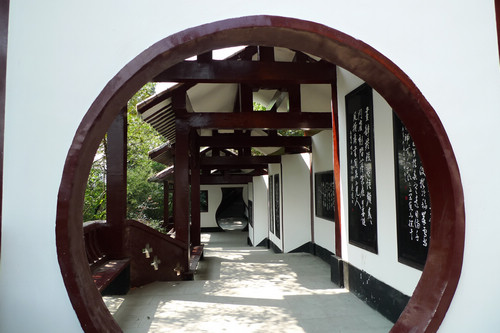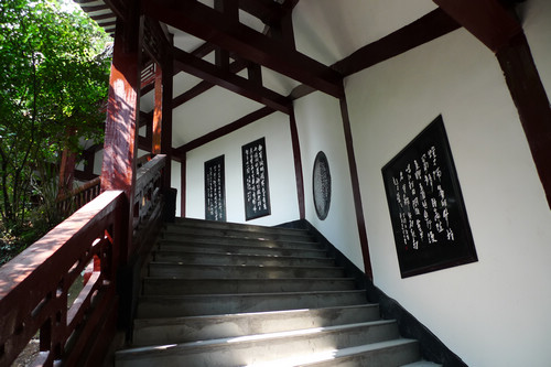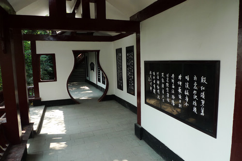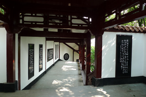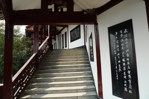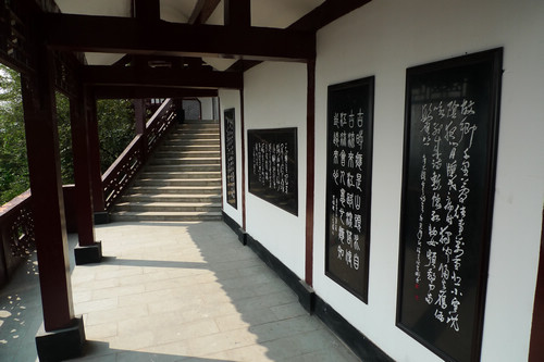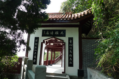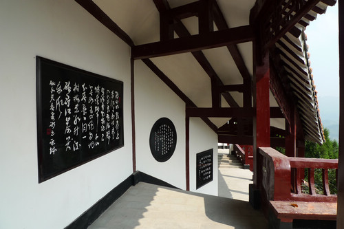 沿凤凰山黄角树至公墓路或经元稹纪念馆一路上行,便可抵达“元稹诗廊”。走近诗廊。便可见“元稹诗廊”书法横匾和圆拱门两边的元稹诗句联。横匾乃行书而为,厚重而拙朴,遒劲有力;楹联乃隶书所作,凝练而开张,端庄古雅。长廊依山的粉墙上,一块块石碑,整齐地排列有序,横幅竖幅,团扇斗方,错落有致,落落大方,青石白字,尽显古朴清雅之境。
