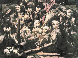 1981年,当时的达县地区要办版画创作班,我在通江空山坝下面那些村转悠了一个多月,这期间都是住在农民家里,收集刻版画用的专用木材,画了不少风景。也是在那一年,陪着来我区的著名画家吴冠中先生和西南师大的几位教师在万源庙坡乡写生。那天飘着小雨,我在乡政府大门旁看见了一张告示,是一张该乡搜寻失散红军的公告,全乡1933年出去当红军的有160多人,结果大概除2人现在某干休所外,其余的不是失踪就是牺牲,我心里一阵惊愕,极为震撼。加上我对红四方面军战斗历程的了解,读过很多回忆录,听过一些在职红军的讲述,了解到大巴山人民对中国革命解放事业做出的巨大牺牲,后来我创作了《北上的连队》和《征程纪事》,形象都是我收集的巴山农民。两幅作品都在中国美术馆展出过,《征程纪事》获国家铜奖。后来峨嵋电影制片厂拍表现“两弹一星”的电视剧《西部痕迹》,还引用了油画《北上的连队》中的一些画面作镜头。