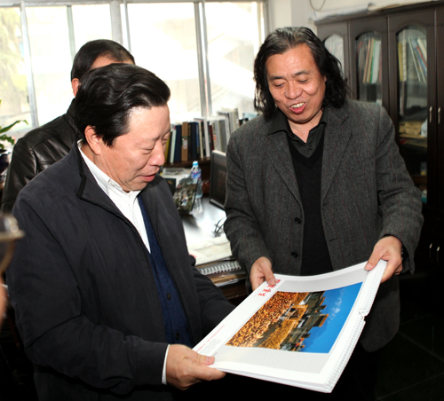 省文联副主席、省摄协主席王达军(左),省文联副主席、省摄协副主席林强(右)向孙家正赠送省摄协为地震灾区特别印制的2011年新年挂历
