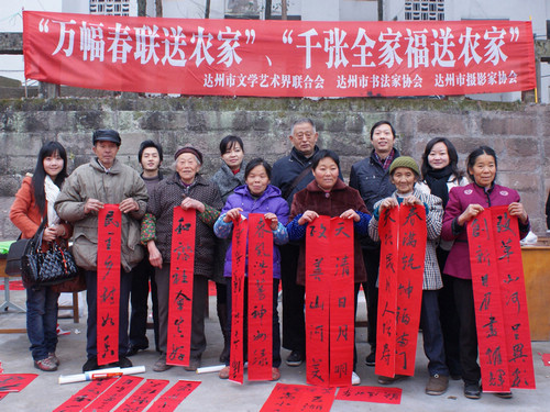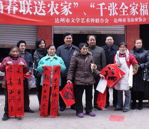根据中共达州市委、达州市人民政府的统一部署和达州市文化、科技、卫生“三下乡”暨“农民读书节”集中示范活动的具体安排,达州市文联围绕中心、分类协调,认真落实、精心组织达州市书协、达州市摄协举行“万幅春联送农家、千张全家福送农家”活动,把党和政府的关怀用文艺的形式带到老百姓家中,在寒冷的冬天给全市广大农民群众送来一顿文化大餐和暖融融的祝福,受到了广大农民群众的热烈欢迎。