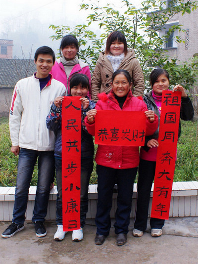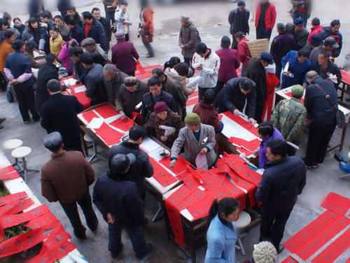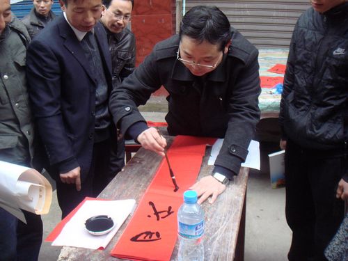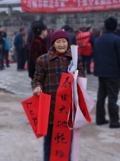 村民们听说有下乡写春联的活动,早早的来到活动点等候。春联书写点从一开始就被围得水泄不通,气氛热烈、墨香四溢。书法家们一边书写“民富九州乐,国强五岳高”、“春惠熏风千里靓,和谐盛世百花研”、“锦绣山河、幸福人家”等幅幅春联,一边与农民朋友亲切交谈。乡亲们热情地递纸张、晾春联。一副副喜庆春联汇集着吉祥祝福,一个个大红“福”字倒映着幸福佳节,笔力雄健,气韵生动,饱蘸着对农民朋友的真情。大家纷纷说到,这么多艺术大师亲自为农民写春联他们几十年都没遇到过,还表示拿到这些特殊的春联,要向家人和邻居展示墨宝,自发的传递来自文艺界的祝福。