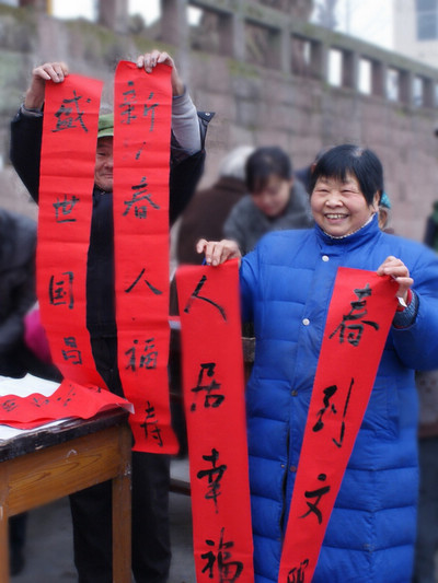 村民王大妈念着手里的对联,笑得合不拢嘴,“艺术家们想得太周到了,过年送春联,真是送到我们的心坎里啰。”周大爷手捧春联愉快地说,平时我们出钱也请不到这么多书法家啊,书法家写的就是不一样,比那些花花绿绿的春联印刷品有内涵多了。