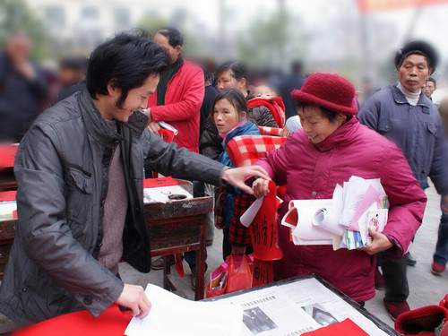 集中示范活动临近尾声,春联书写点依然是人头攒动,拿到春联的村民相互展示自己的收获,乐呵呵的说自己今天多么幸运,还没拿到春联的村民则略显着急,书法家们一边安慰还没拿到春联的农民一边辛勤的创作,保证有求必应,满足到场的每一位村民,直到所备的纸张全部用完。