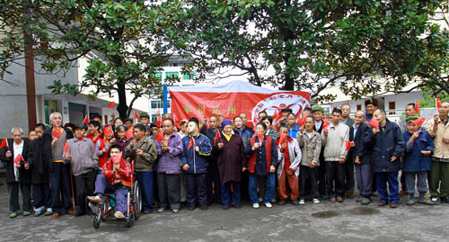 在院子空坝的一处高低杠上挂好为他们特地制作印有“幸福生活、和谐老龄”等字样的幕布后,由先集体后自由组合的顺序,老人们手拿五星红旗,依次在幕布前留影。有些老人还兴冲冲地跑回房间,换上了自己最满意的衣服照相。“这里的老人大多数都没照过相,他们都想好好照两张照片,寄给家人看看。”49岁的工作人员孙庭苏握住万燕明的手说道。