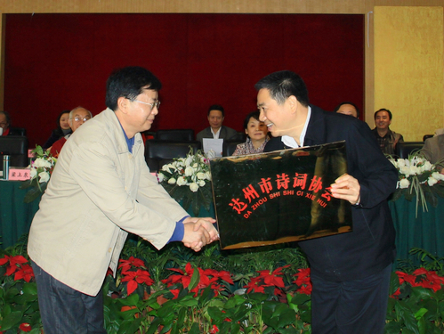 市人大主任、市诗词协会名誉主席胥健(右)为市诗词协会授牌