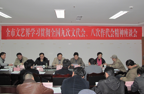 本网讯 12月5日,市文联召开全市文艺界学习贯彻全国九次文代会、八次作代会精神座谈会。市委宣传部副部长、市文联党组书记常荣,市文联主席马骏华,市文联党组成员、副主席兼秘书长谢军,市文联兼职副主席赵英、邹亮、梅光辉、谭仕海,各市级文艺家协会主席、秘书长,通川区、达县文联负责人,市文联各部室、《西部潮》杂志社工作人员参加了座谈会。