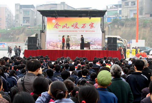 本网讯 3月19日,天气晴朗、阳光明媚,早春的宕渠大地喜气洋洋。达州市2012年“春风暖万家”文化、科技、卫生“三下乡”集中示范活动在渠县天星镇举行。市委书记焦伟侠巡视活动现场看望慰问干部群众;市委常委、宣传部长杨娟出席活动并致辞。活动现场,市委宣传部、市文广局、市文联组织文艺工作者为当地老百姓送去了丰富多彩的文艺演出和艺术作品,市级相关部门开展了科技、文化、卫生知识咨询,为当地老百姓送去了资金、项目、书籍、药品、资金、体育用品等。