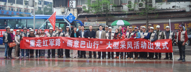 本网讯 细雨如丝,春意正浓。4月9日上午,为纪念红军入川80周年,由中共达州市委宣传部、达州市文联主办;通川区、宣汉县、万源市委宣传部和达州市美协承办的“重走红军路•画意巴山行”大型采风活动授旗仪式在新世纪广场隆重举行。