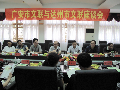常荣主持座谈会。马骏华介绍了达州市文联基本情况和达州文艺事业发展状况,并希望广安市文联各位领导和同仁对达州文艺和文联工作不吝赐教,多提宝贵意见和建议。