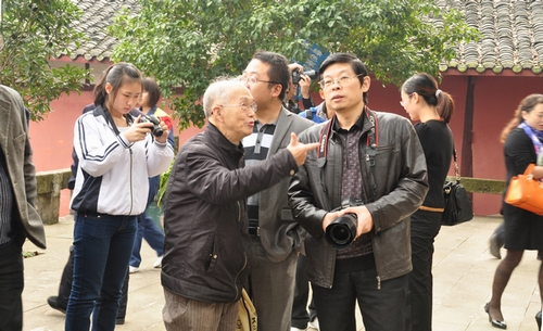 >80高龄的开江前辈诗人黄良鉴先生为采风人员讲述金山寺的故事<