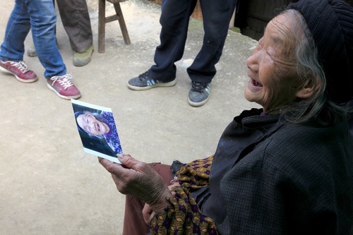 >拿着摄影家赠送的精美照片,面对相机的村民,会心地笑了<