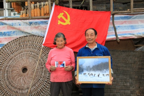 >农村老党员、留守老夫妻唐正坤夫妇在党旗前留影<