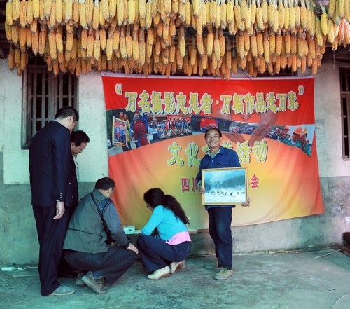 本网讯 为迎接党的十八大胜利召开,响应中国摄影家协会“万名摄影志愿者,万幅作品送万家”、“影像留真情,爱心传万家”文化公益活动的号召,10月18日,肖光泉、万燕明等7名达州摄影志愿者,走进达县平滩乡社区和水桐坝村6组,将12幅精心装帧的自己的风光摄影作品赠送给勤劳朴实的村民,让他们也能从精美的摄影画面中读到不曾看到过美景,并为他们留影,记录下他们的幸福瞬间。