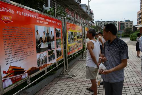 本网讯 7月1日,开江县庆祝中国共产党成立92周年暨“同筑复兴路,共圆中国梦”经济社会发展成就展在县清河广场展出。