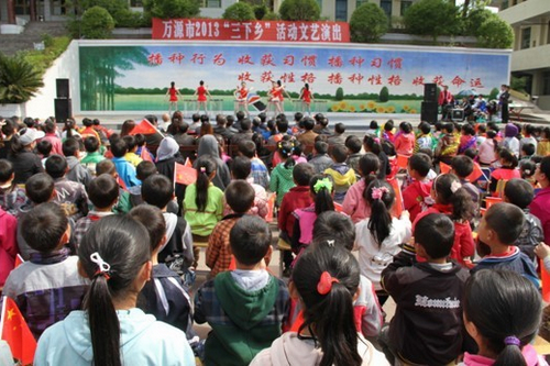 本网讯 宣传十八大,服务在农村。2013年4月22至27日,由中共万源市委宣传部主办,万源市文联、市文广局、市科技局、市卫生局等相关部门协办的“三下乡”活动分别在青花镇、虹桥乡、白果乡、井溪学校、井坝村、青龙嘴村、烟霞山旅游景点等地开展。