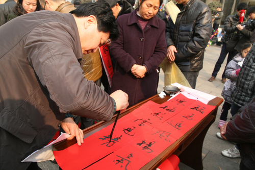 一幅幅喜庆春联汇集着吉祥祝福,一个个大红“福”字倒映着幸福佳节,笔力雄健,气韵生动,饱蘸着对群众的真情。一位从数公里外闻讯赶来的群众拿到春联后激动地说到,省市区文联同时组织著名艺术家为老百姓写春联他们连想都敢想过,现在竟然梦想成真了,一定要拿到这些特殊的春联,要向家人和邻居展示墨宝,自发的传递来自文艺界的祝福。