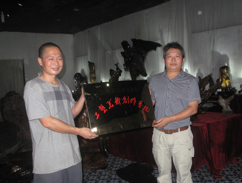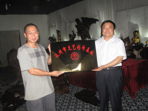 >市文联副主席、市美协主席龙飞(右)为“楠香苑”授牌“工艺美术创作基地”<