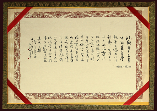 据了解,书法作品由人民大会堂收藏非常不易,在此之前我市尚无先例。该藏品为马骏华受人民大会堂管理局邀请专门创作而成,作品长352CM,高96CM,为巨幅行书。