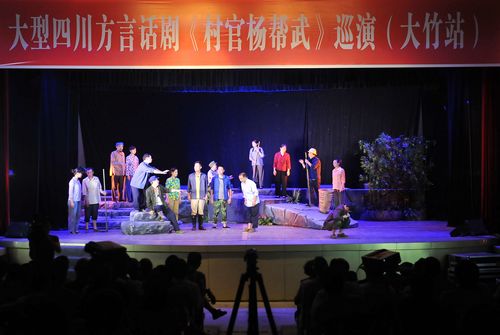 本网讯 7月14至15日,大型四川方言话剧《村官杨帮武》到大竹县文化馆进行了巡演。县委书记何洪波在演出前致辞。达州市委第15督导组组长曾小波、市委第15督导组成员黄红、市文广新局副局长郑永福和大竹县1000余名党员干部及群众代表到场观看了演出。