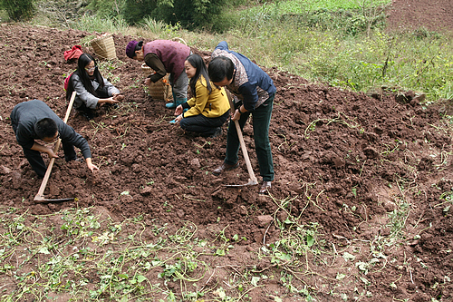 >图:2014年11月19日,市文联副主席肖朝萍(右二)一行与村民一起劳动<