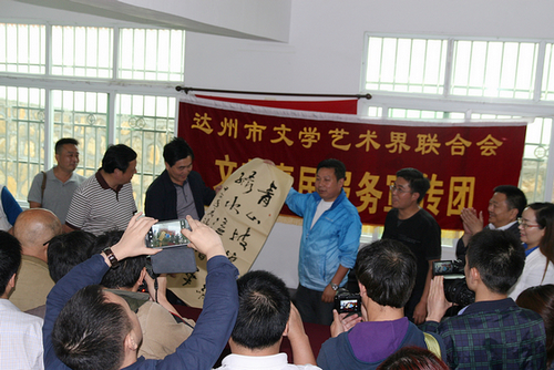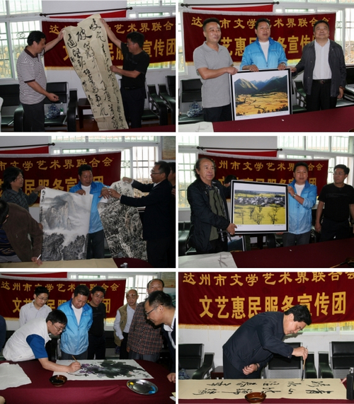 随后,文艺家们来到村委会办公室,和村干部、村民面对面交流互动。达州市委宣传部副部长、市文明办主任常荣,达州市文联党组书记姚军,达州市文联主席丁长兴,万源市委常委、宣传部长黄中平先后向村民赠送了《巴山文艺》杂志以及文艺家们近期和现场创作的讴歌万源秀美山水风光的书法、美术、摄影作品。达州市文联调研员、市书协主席马骏华,达州市文联副主席、市美协主席龙飞,达州市摄协主席李开杰,达州市美协副主席、大世纪书画院院长肖超等与万源的文艺家们一同参加了创作和捐赠活动。