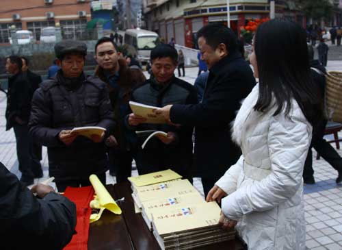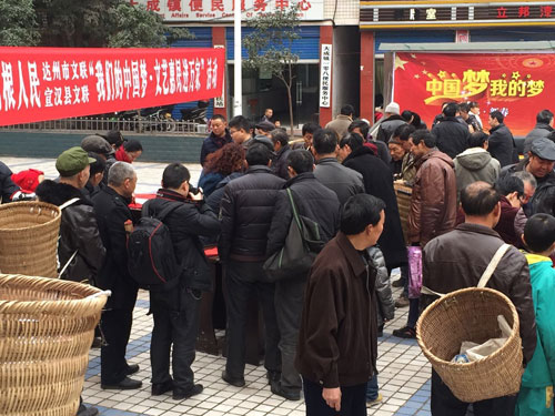 本网讯 2月5日,恰逢宣汉大成镇是个赶场天。这天一清早,由达州市文联、宣汉县文联和巴山书画院联合组织的20多名书法家、摄影家在达州市文联主席丁长兴、副主席肖朝萍,宣汉县委宣传部副部长、县文联主席姚启进同志的带领下,前往宣汉县大成镇中心广场开展“我们的中国梦•文艺惠民进万家”活动,为当地老百姓免费书写春联、送《巴山文艺》刊物、拍全家福,受到大成镇人民群众的热烈欢迎。