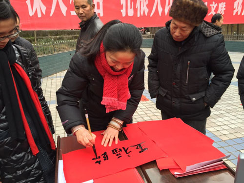 活动现场,艺术家们激情满怀、挥毫泼墨,农民朋友兴高采烈地排起长队争着抢着要春联,有的在选择春联内容,有的高高兴兴拿着写好的春联等墨干,一个接一个,一张接一张,10多个书法家几乎没有停笔,一连几个小时,没喝一口水、甚至没直一下腰,但没有一个艺术家喊累。这边,摄影师们也忙得不亦乐乎,拍照、现场冲印、出照片一条龙服务,在喜庆的“中国梦•我的梦”和一个大大的“福”字背景布前,许多农民朋友携家带口,随着摄影师手中的相机,露出了幸福的笑容,留下了快乐的全家福,一家家捧着手中的照片,都乐得合不拢嘴。