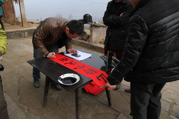 12日,文艺志愿者一行10人就从城内出发前往河口镇东林坝村,一到村上,摄影家们就立即为村民拍摄全家福,书法家们也倾心为村民书写春联,村民都争先恐后上前拍照,都想早点拿到自己的照片,有的村民一家四、五口人坐在一起,照上了一张满意的全家福,有的村民家中的亲人还没回家,一个人也拍了一张留作纪念。书写春联的书法家有求必应,为村民编写了许多祝福的话,东林坝村民张蓉要求书法家写了“一帆风顺年年好,万事如意步步高”的春联,该村党支部书记潘明才要求书法家写了他自己编的“政通人和年年好,风调雨顺岁岁安”的春联,他们以此来表达对党的感恩和颂扬。
