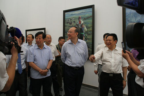 >尹力(中)、刘大为(左)、蒋东生(右)与嘉宾、群众一同观展<