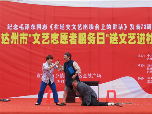 伴随着一阵阵欢快的锣鼓声,记者快步来到广场,仔细一打听,原来是为隆重纪念毛泽东同志《在延安文艺座谈会上的讲话》发表73周年,由中共达州市委宣传部、达州市文联主办,达州市戏剧家协会、达州市美术家协会、达州市书法家协会承办,宣汉县委宣传部、宣汉县文联协办的“达州市文联文艺志愿服务队送戏到社区”的演出即将在这里举行。
