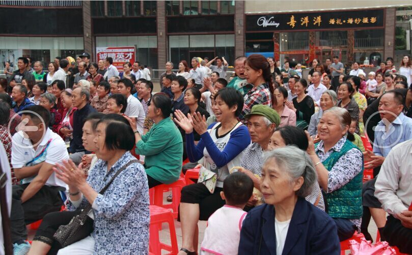 9点45分,雨过天晴,天空做美。演出在欢快喜庆的舞蹈《幸福村的笑声》中开始,通过演员们优美舞姿,欢快笑声,传达出了新农村家乡的巨变,感受到了幸福的生活;一曲女声独唱《祝福祖国》歌曲唱响了时代的主旋律,唱出了对祖国明天的祝福;魔术《幻变》、小品《请客疯》不但让在场的观众笑得合不拢嘴,更让现场迸发出连绵不绝的掌声和喝彩;京剧《迎来春色换人间》、唢呐演奏《春到山乡》更是另人陶醉;方言独白《赌徒的自白》,法治宣传小品《调解》那些脍炙人口的经典段子,更是把整台演出推向了高潮。整台演出10个节目让不仅为现场的观众送来的欢笑,更让老百姓通过观看节目表演的方式展示了依法、守法、懂法的重要意义,一位牵着孙女的大妈拉着一位志愿者的手说:“你们好久又来哟,我们好久没看到这样的节目了,我家大孙子要放暑假了,叫他也来看。”