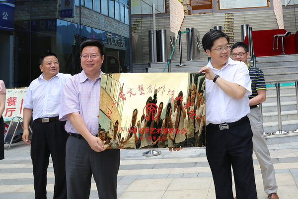 >四川省文联党组副书记、副主席李兵(左二)授牌,万源市委书记王成军(右二)接牌<