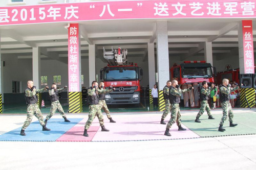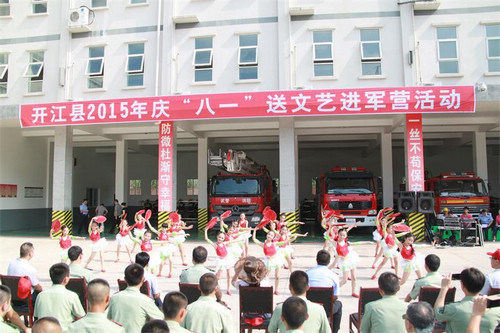 本网讯 7月28日,开江县委、县政府为庆祝建军88周年、纪念中国人民抗日战争暨世界反法西斯战争胜利70周年,组织开展文艺家、文艺志愿者送文艺进军营活动,在县消防大队操场与广大官兵共同庆祝“八一”建军节的到来。县委常委、人武部政委何成伟出席活动,县委常委、宣传部长黄龙德作活动致辞,县公安局政委唐晓主持庆祝活动。